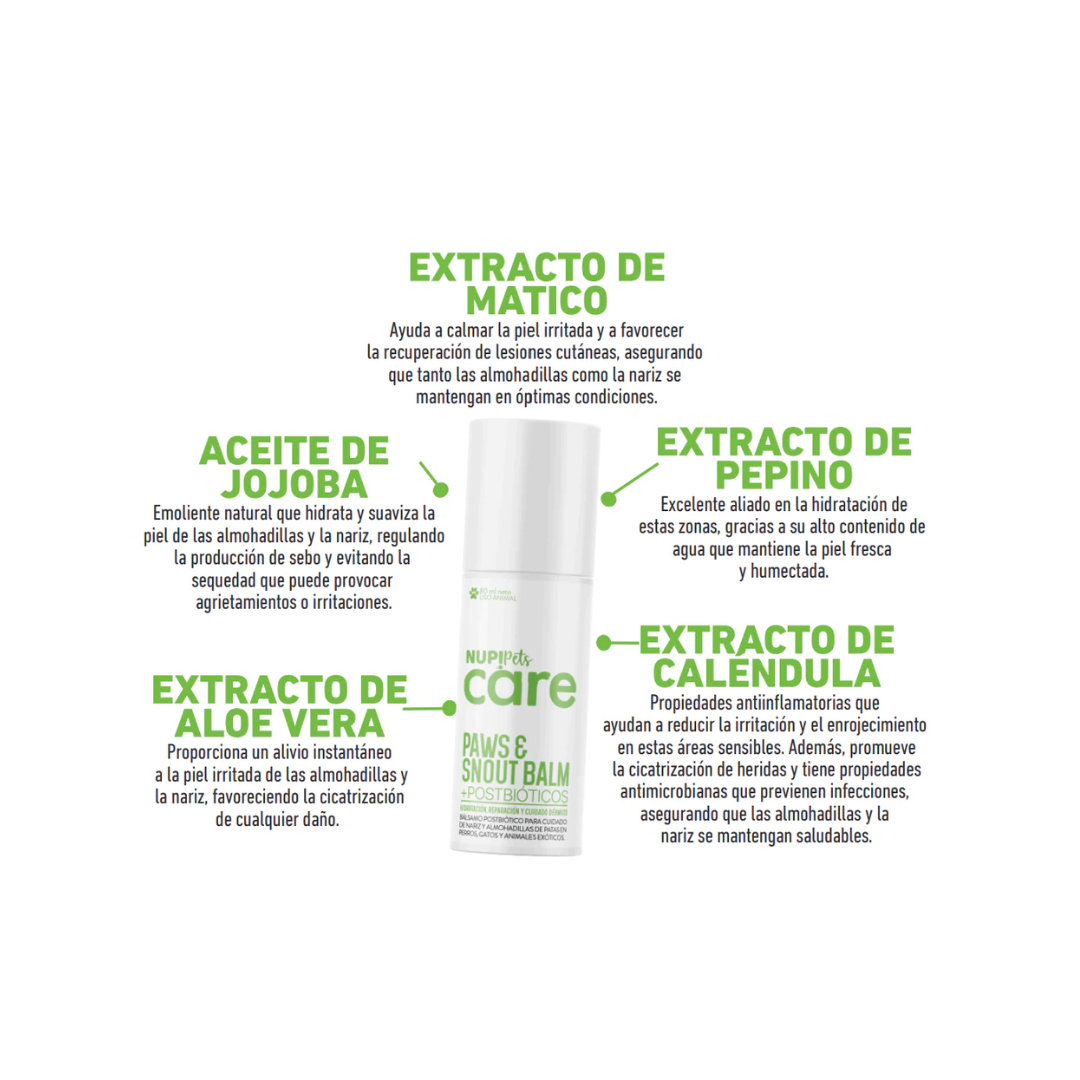 Protege y regenera las zonas más sensibles de tu mascota con NUP!Pets Paws & Snout Balm, un bálsamo roll on enriquecido con postbióticos y extractos naturales. Formulado para perros, gatos y animales exóticos, este producto mantiene las almohadillas y nariz hidratadas, fortalecidas y saludables. La combinación de ingredientes activos proporciona una barrera protectora que previene el resecamiento y favorece la regeneración natural. Dale a tus mascotas el cuidado especializado que merecen.