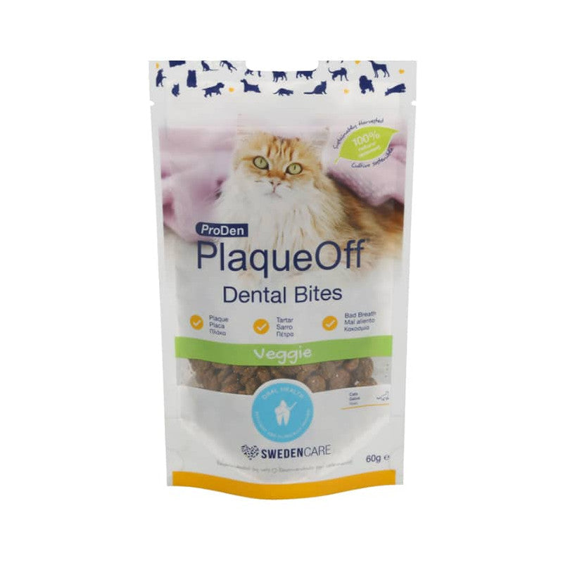ProDen PlaqueOff® Dental Bites es un suplemento natural diseñado para mantener la higiene bucal diaria de tu gato. Presentados en sabrosos bocados, son perfectos para premiar a tu mascota mientras proteges su salud dental. Contienen un alga especialmente seleccionada, comprobada clínicamente para disminuir la placa, el sarro y el mal aliento. Su formato fácil de administrar y su fórmula 100% natural, sin azúcares, aditivos, conservantes ni colorantes, hacen de ProDen PlaqueOff® una solución efectiva que actúa desde el interior. Bolsa de 60 g.