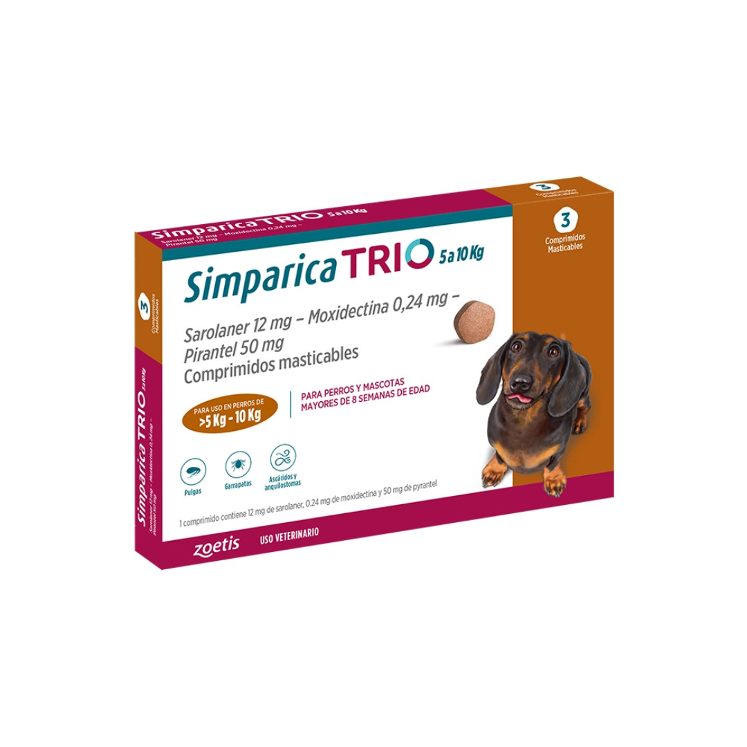 Simparica® Trio ofrece un tratamiento oral integral para perros, enfocándose en el cuidado tanto interno como externo para mantener su salud ante agentes ambientales habituales. Presentado en tabletas masticables y sabrosas, es fácil de administrar a perros desde las 8 semanas y que pesen al menos 5 kg. Su combinación de ingredientes activos combate pulgas y garrapatas mientras contribuye a mantener el equilibrio intestinal frente a problemas digestivos comunes. Disponible en diferentes dosis según el tamaño del perro, es ideal para formar parte de programas de cuidado recomendados por profesionales veterinarios.