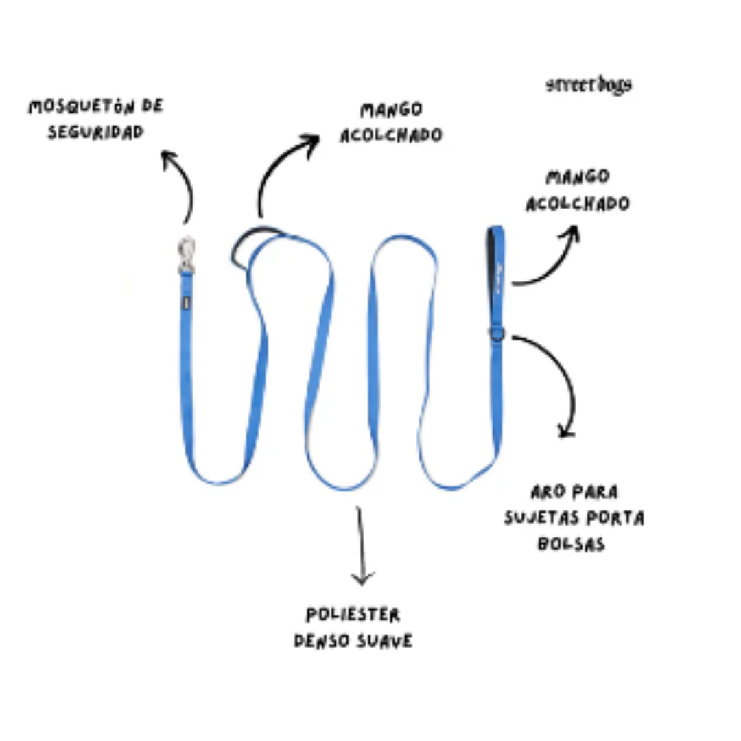 La Correa de Adiestramiento Street Dogs ofrece el equilibrio perfecto entre comodidad y control durante los paseos y entrenamientos. Fabricada con polyester denso, es ligera y suave al tacto. Su mosquetón giratorio de 360 grados con mecanismo de seguridad garantiza que nunca se enrede. Cuenta con dos mangos acolchados: uno a 80 cm para un control preciso y otro al extremo para una mayor libertad. Con 3 metros de largo y 2 cm de ancho, esta correa es ideal para quienes buscan un producto liviano y funcional.